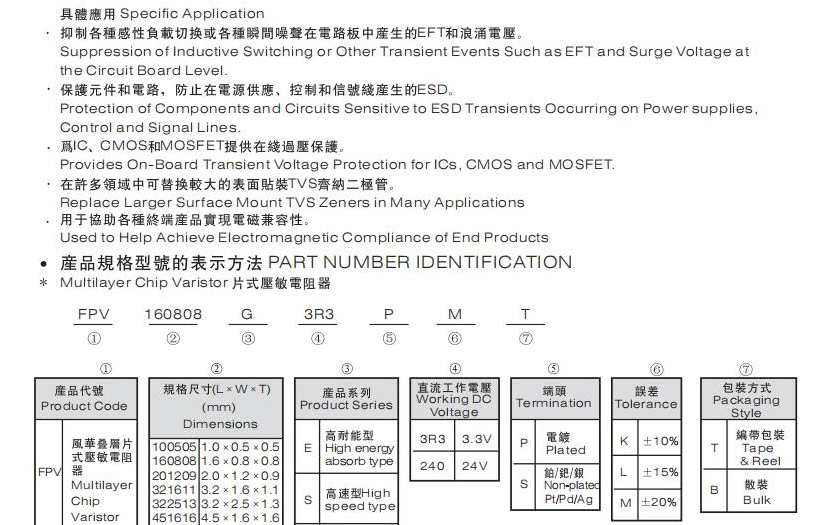 如上圖所示,風(fēng)華的貼片壓敏電阻FPV系列共有四種,通用系列是FPV貼片壓敏電阻主要的一種,工作電壓寬,可靠性強(qiáng),應(yīng)用非常廣泛,可以為各種IC提供浪涌電壓保護(hù),替代齊納二極管,而高耐能系列專為吸收電路中存在的能量較大的瞬態(tài)電壓噪聲而設(shè)計(jì)的,保護(hù)原件和電路為IC,CMOS和MOSFET提供在線過壓保護(hù),在許多領(lǐng)域可替換較大的貼片TVS齊納二極管。高速系列貼片壓敏電阻容量非常低,為高速數(shù)據(jù)線和其他高頻領(lǐng)域提供ESD和EFT保護(hù),應(yīng)用在視頻音頻接口,便攜式手提設(shè)備,工業(yè)及醫(yī)學(xué)儀器,包括液晶顯示器LCD。貼片壓敏電阻所占的空間更少,可以減少PCB板面積,用于多線浪涌抑制,應(yīng)用在各種多線浪涌抑制且對(duì)空間要求苛刻的電路板中。